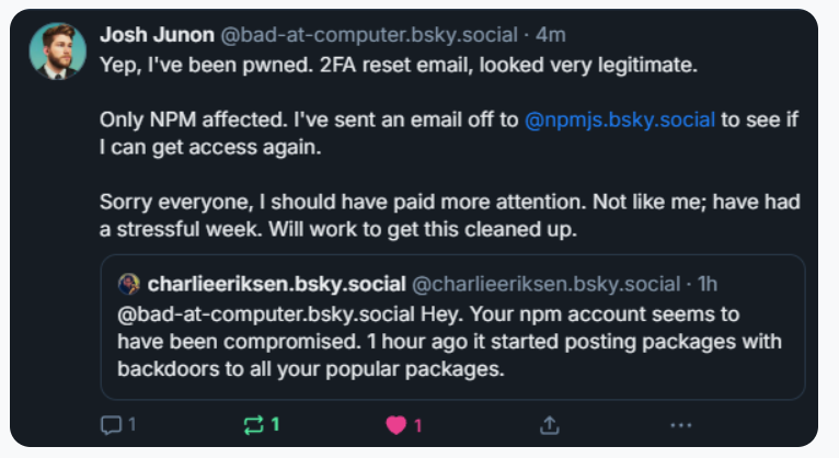 Aikido said it used the social network Bsky to notify the affected developer, Josh Junon, who quickly replied that he was aware of having just been phished. The phishing email that Junon fell for was part of a larger campaign that spoofed NPM and told recipients they were required to update their two-factor authentication (2FA) credentials. The phishing site mimicked NPM’s login page, and intercepted Junon’s credentials and 2FA token. Once logged in, the phishers then changed the email address on file for Junon’s NPM account, temporarily locking him out.