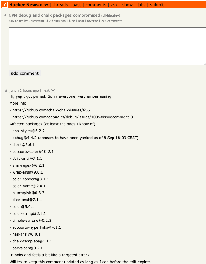 Junon’s mea cupla on Hackernews today listed the affected packages.