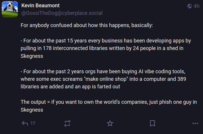 “For about the past 15 years every business has been developing apps by pulling in 178 interconnected libraries written by 24 people in a shed in Skegness,” Beaumont wrote on Mastodon. “For about the past 2 years orgs have been buying AI vibe coding tools, where some exec screams ‘make online shop’ into a computer and 389 libraries are added and an app is farted out. The output = if you want to own the world’s companies, just phish one guy in Skegness.”