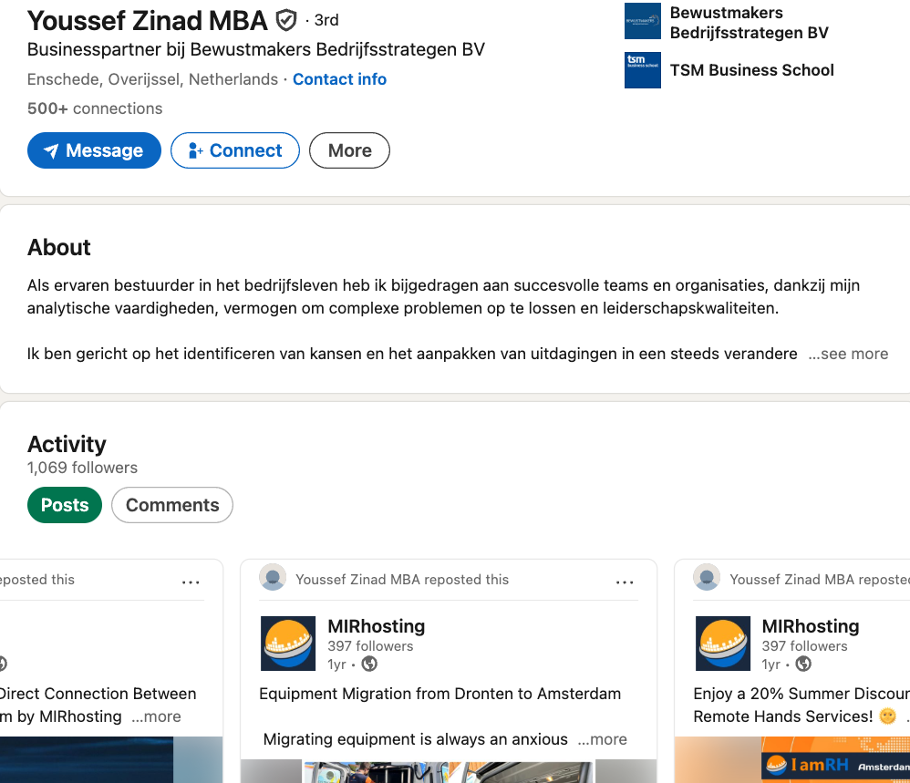 The incorporation document says the company was formed in 2019 by a [email protected]. That email address corresponds to a LinkedIn account for a Youssef Zinad, who says their personal websites are worktitans[.]nl and custom-solution[.]nl. The profile also links to a website (etripleasims dot nl) that LinkedIn currently blocks as malicious. All of these websites are or were hosted at MIRhosting.